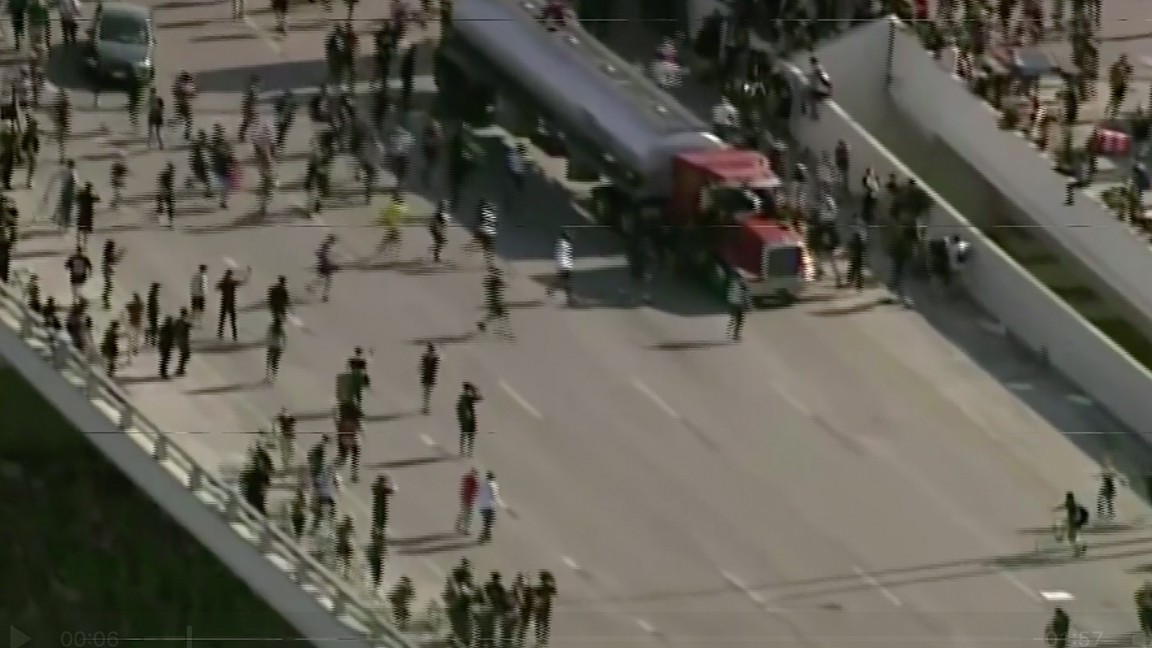 A group of about 100 protesters reportedly blocked a major north-south freeway in downtown Los Angeles.